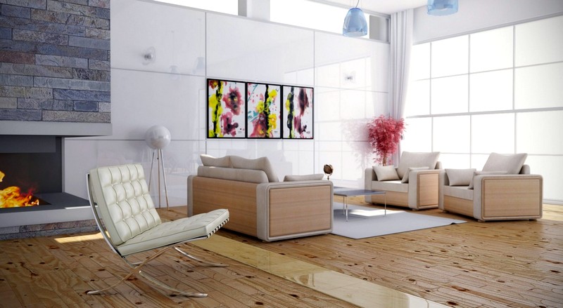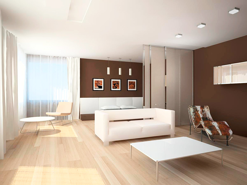 The flooring is covered with a laminate decorated in natural wood. The central zone must be distinguished by a white carpet, on which a coffee table is harmoniously located.