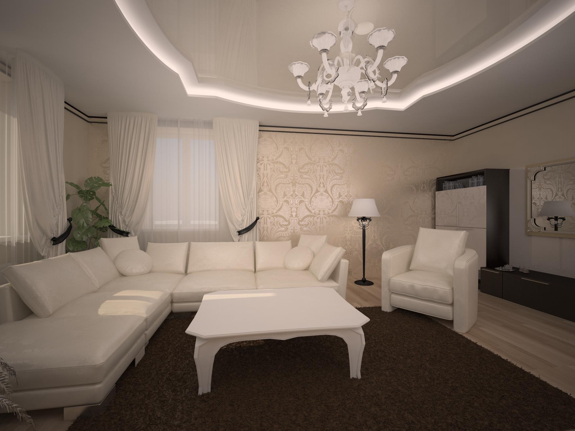 The walls have a sophisticated architectural finish. Wallpaper alone is not enough. To zonally delimit the wall space, inserts are made that mimic the columns. Traditionally, the television area gets off in this manner. Wallpaper is selected beige and golden hue. Patterned paintings expressing flashy wealth will be very appropriate here.