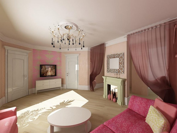 Walls are best finished with pale pink paint. The matte effect will be a great addition to the space. The architectural composition containing elements of Greek and Roman structures will look original. An arched passage instead of a door will visually increase the space of the room. The longest wall is equipped with beautiful columns. In this case, you can select the area of the TV. For this, the equipment is hung on a wall partition. Part of the wall remains of ordinary performance. Another section is finished with drywall, thanks to which you can equip an interesting composition of open shelves and columns. A semicircular arch is made above the TV, the niche of which is complemented by neon lights. Choose the matching color of the glow lamps. In our case, red is perfect.