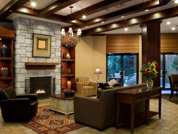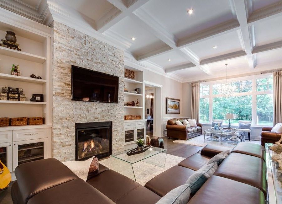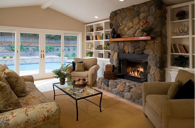 Near the upholstered furniture, a composition with a fireplace is mounted on the side. The entire chimney, as well as the adjacent wall, is finished with natural stone of a large oblong format. The palette is sand or peach, with inserts of red brick tone. Due to the natural texture of stones, the composition will be very lively, natural.