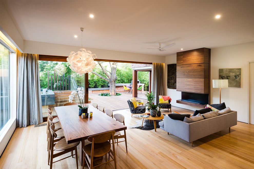 By combining several rooms, unique layouts are achieved. It is very convenient to cook in the kitchen in the summer and immediately relax near the sprawling tree branches planted next to the terrace.