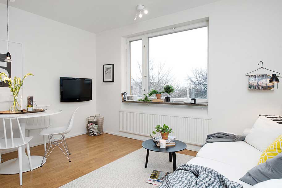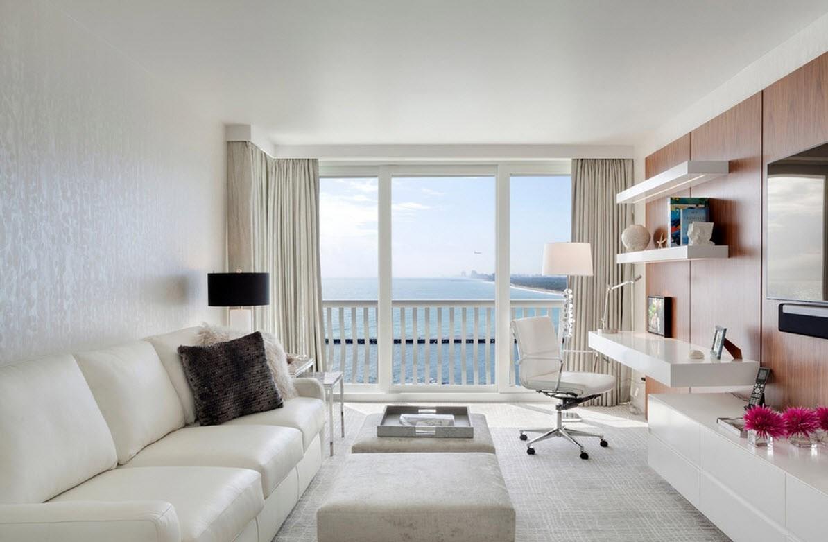The crystal white room is distinguished by its brightness. If the sun's rays are a frequent occurrence, then it will be possible to save money on lighting devices. When planning dark accents, they should be placed opposite the window openings. This will compensate for the light loading of the room.