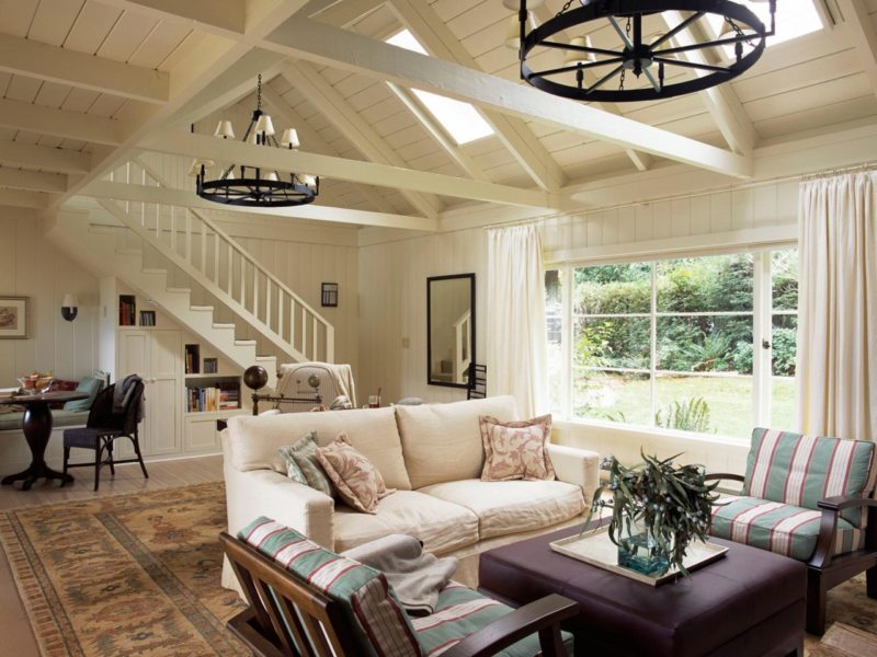 When arranging the interior of the guest space, you should adhere to the rule of three colors. Such a room will differ in the required severity, as well as combine colors. For example, this is expressed by the main white range, combined with brown, which is diluted with yellow interior elements.