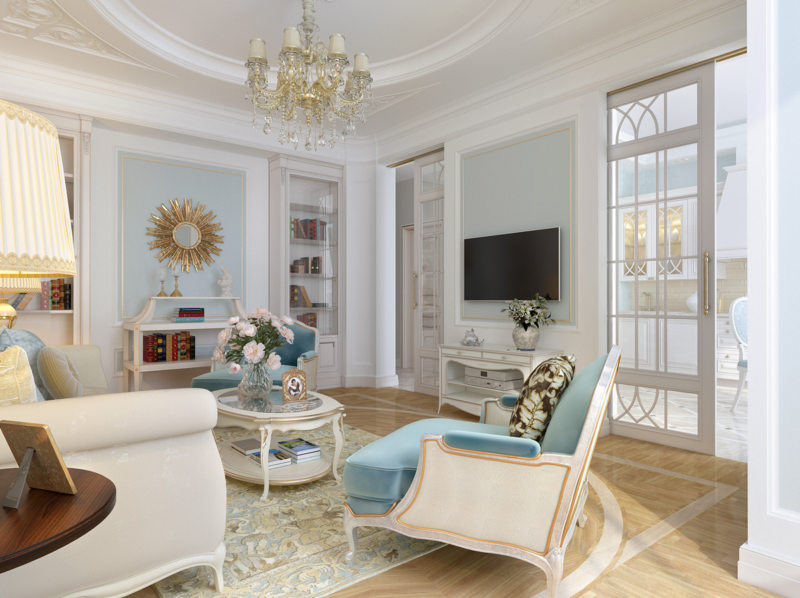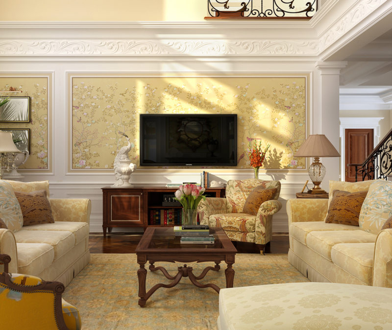 The widespread use of painted furniture will give the room a certain charm. White facades of cabinets and shelves are decorated with intricate patterns. The composition drawn near the TV looks interesting. Get a special stand, complemented by cabinets, shelves. In open spaces, contrasting figurines of a black or red palette can be placed. Patterns on the facades or panels of cabinet doors are selected most often of golden design. Black also harmoniously complement the guest.