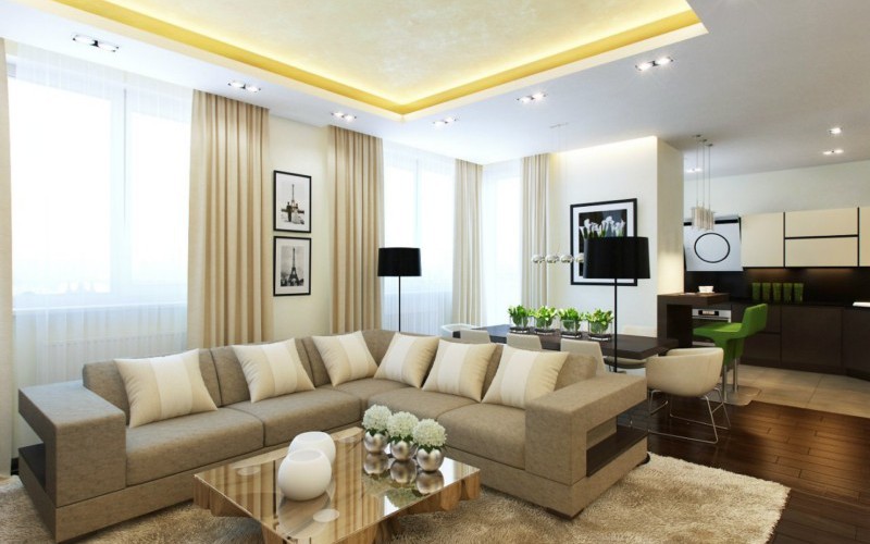 The walls of the hall are finished in pale beige.Black and white photographs of cities and their attractions will successfully dilute the interior of the living room. Window textiles are purchased in dark beige. Satin curtains are additionally illuminated by ceiling lights aimed directly at the fabric.