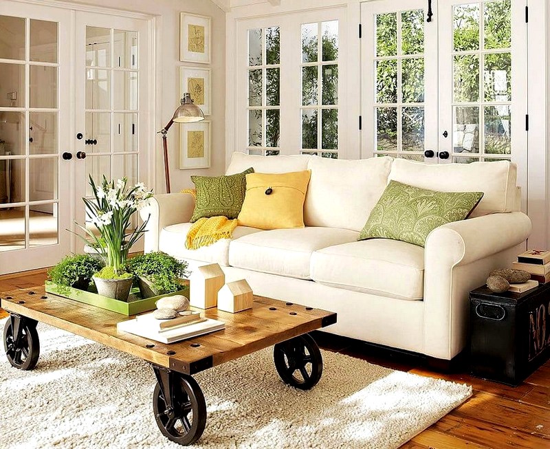 It will be interesting to combine the "Scandinavian" type of layout with the "Loft". Expressing this motive, the coffee table is made of an ordinary tray, painted in white. To give the table an even base, a piece of glass is laid on it, with faceted edges.