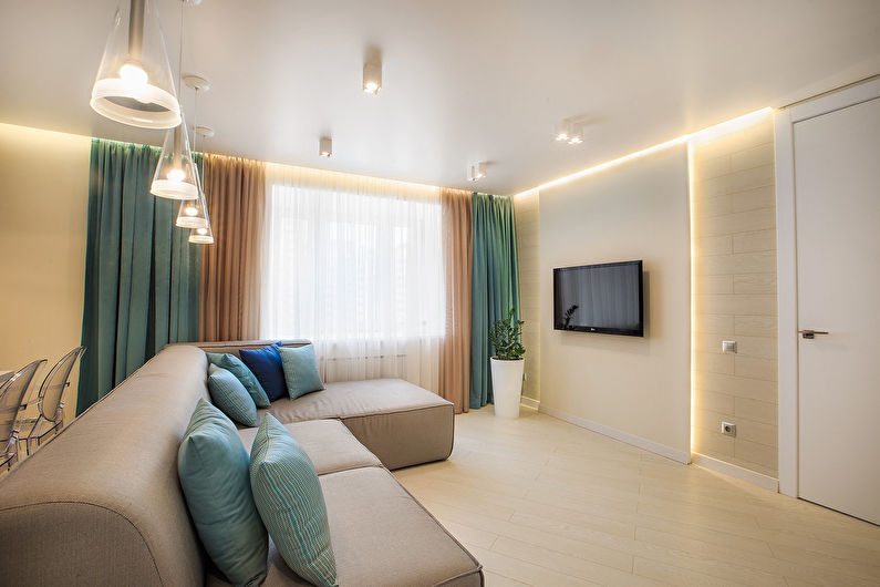 Multilevel ceilings also remain popular. They allow you to create an interesting design of the living room, hide communications and hold spotlights. But this option is only suitable for rooms with high ceilings.