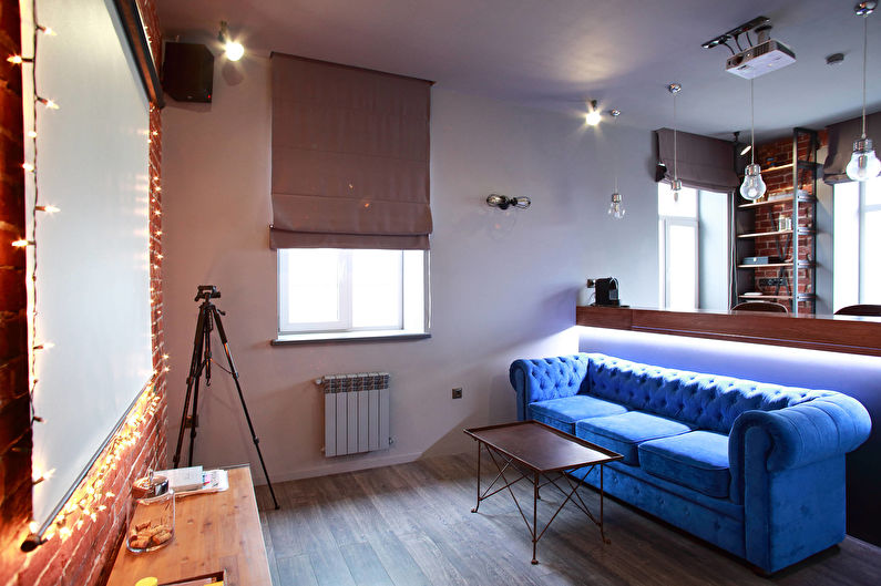 Separate the kitchen from the rest of the room will help the bar. The bed will hide the wardrobe. Place the work area in a corner or at the window. Equip the center of the room as a relaxation area: place a small sofa, a coffee table and a TV here.