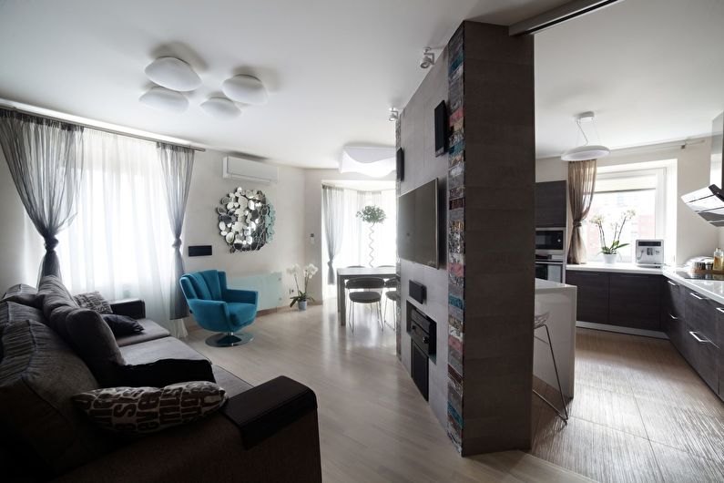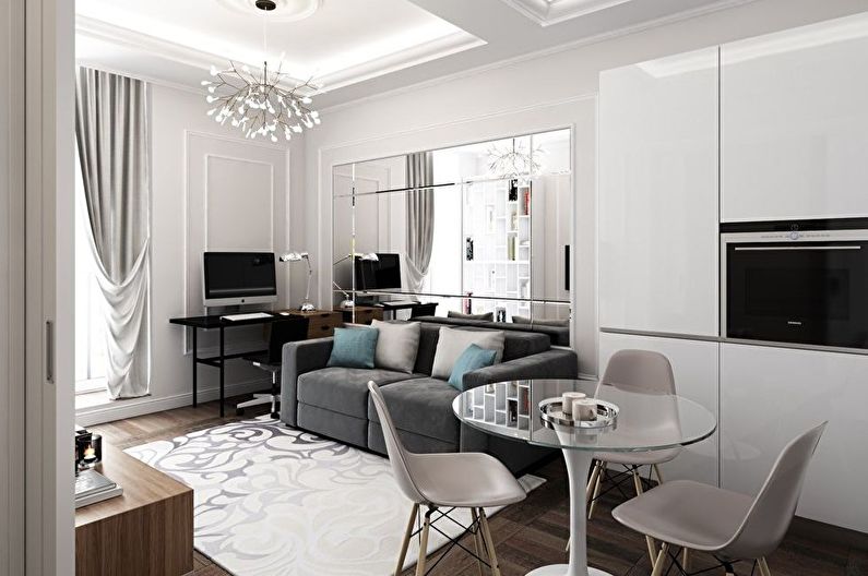 Sometimes the living room is not only a place for friendly or family gatherings. This area has to be combined with a study, kitchen or bedroom. In order for it to perform its functions correctly, it is necessary to adhere to some design rules.