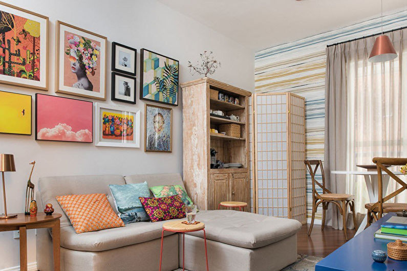 The living room can be decorated in a single style or combine several areas in one interior