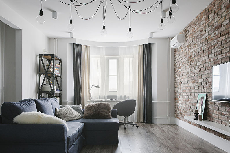 The loft is characterized by imitation of roughly finished surfaces - open brick and gray concrete