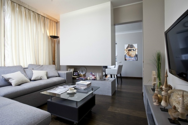 Dressing the rooms held with a minimum number of elements. Eventually interior it turns out free, an atmosphere of light reigns. Things and objects are hidden in lockers, wall which emphasizes the "emptiness" of interior.