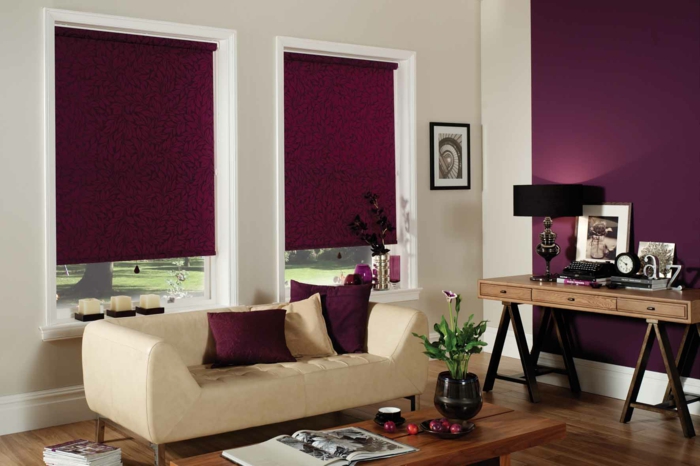 For living room A combination of blinds and curtains is perfect. She will protect the room from sunlight, especially if they are excessively disturbing. For the rooms, in which dark shades predominate, curtains of bright colors are well suited.