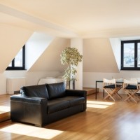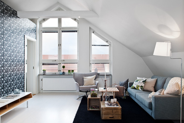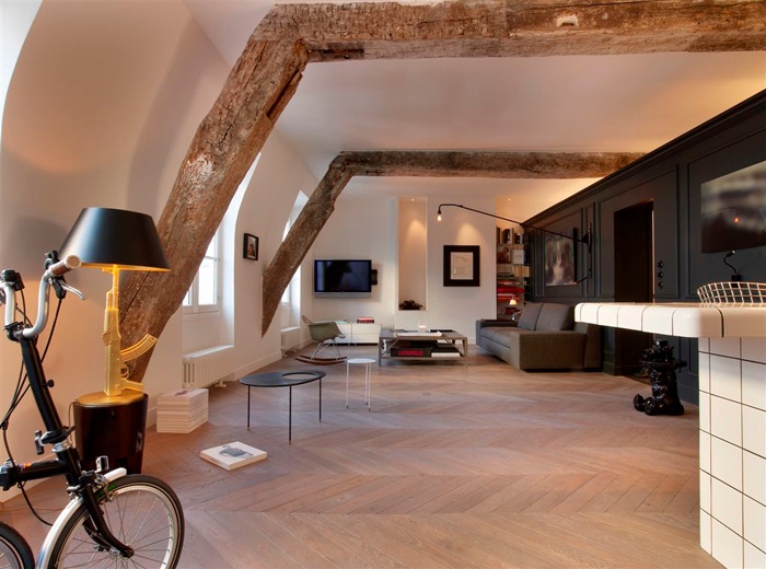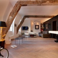 The loft looks very nice in a classic project, as in the photo. Light, white shades, black framing of window frames and wooden ceilings - an interesting, unusual solution. In the interior, it is possible to combine furniture and other objects from different materials. Recently, natural materials and ceramic tile flooring are considered relevant. Some still prefer laminate flooring.