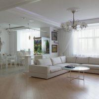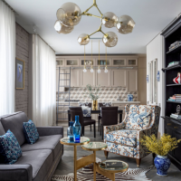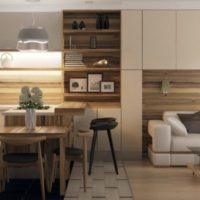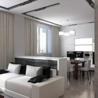 The distinction between the kitchen and the hall by zoning is a very good solution. With this approach, it is possible to create an unusual, original apartment design. For clarity, we will analyze several zoning options: