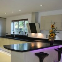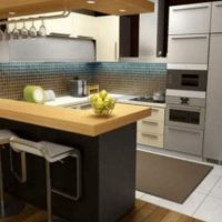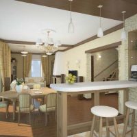 In addition to the bar, the combination of the island part of the countertop, complemented by a raised table (instead of the bar counter), will look good. On the one hand, just from the hall, you can sit at the bar, and it’s convenient to cook food from the kitchen.