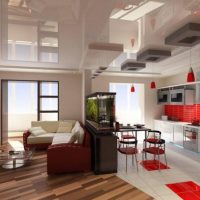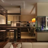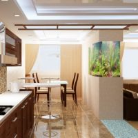 - Zoning with functional interior items. For example, it is good to separate the kitchen space from the living room with a dining table fenced by an additional decorative partition. An angular bar counter or even an aquarium in general will also perfectly cope with this task.
