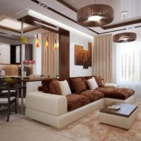 The functional way seems to be the most practical. On the border is a massive, roomy sofa. You can arrange a dining area with a decorative partition here. It will turn out to combine both methods. It is better if the partition is additionally hung with decorations, small details or even flowers in pots. With this arrangement, the dining area is done in the hall. But it is possible in the kitchen space.