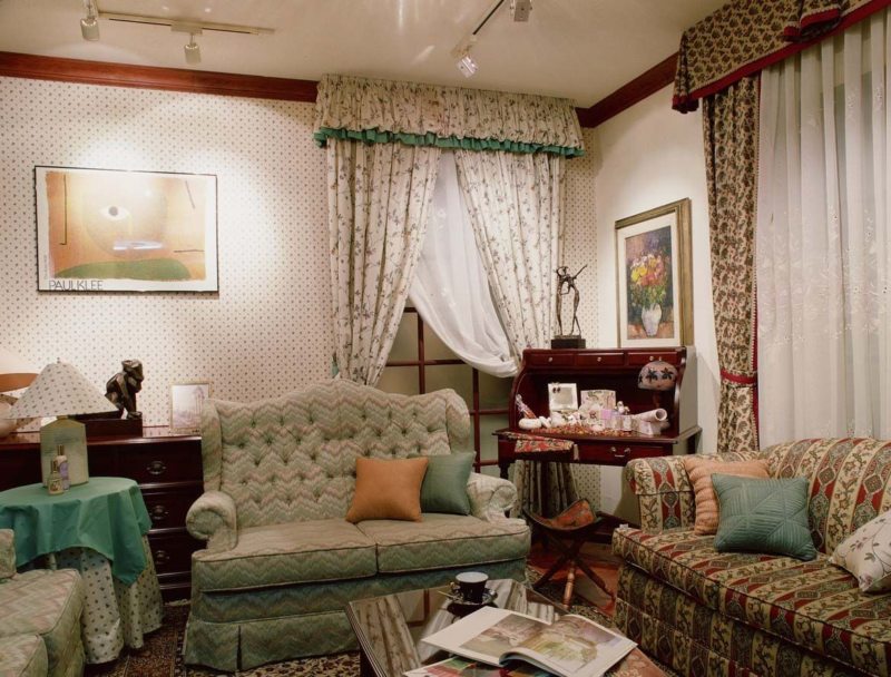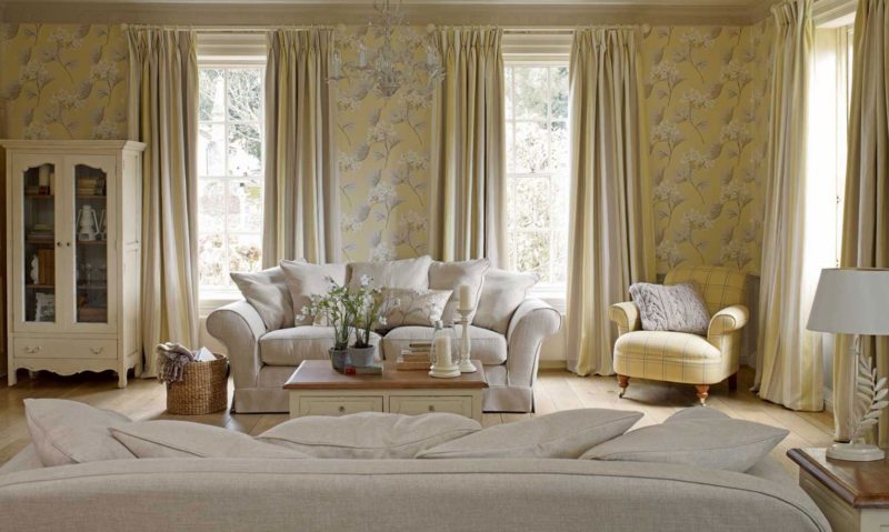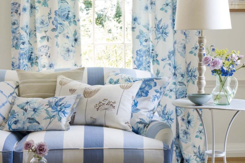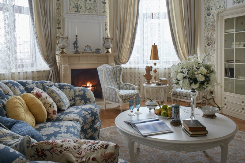 Printed natural cotton fabric curtains look good in the living room. Textiles are usually decorated in white and blue, but variations are possible. The use of pastoral and neoclassical plots is typical.
