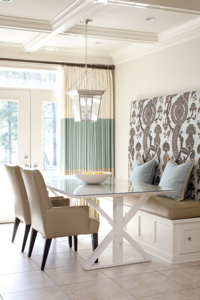 The color of linen curtains should be repeated in tablecloths or in upholstery