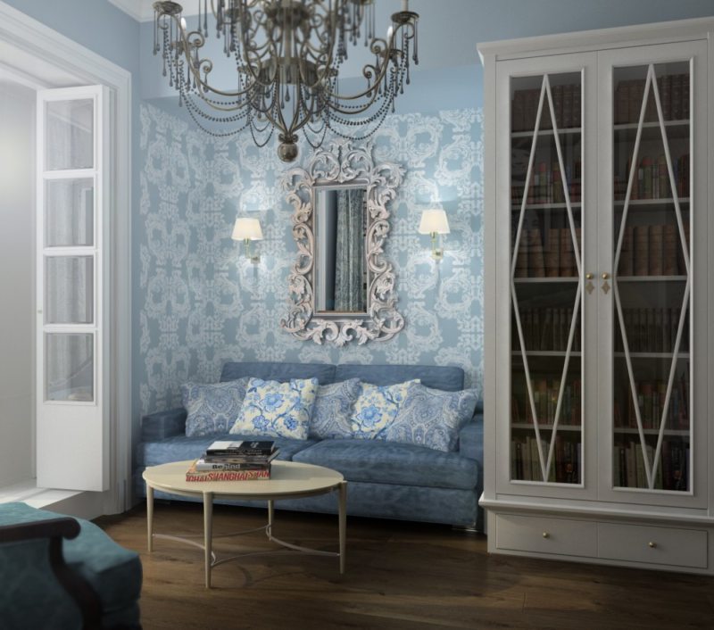 For the French style, furniture upholstery with an ornament in the spirit of Russian painting Gzhel is perfect