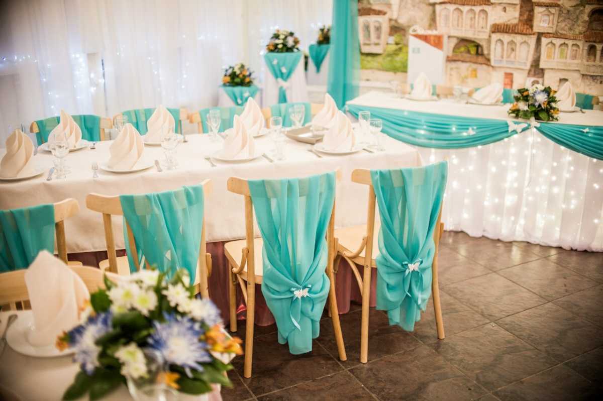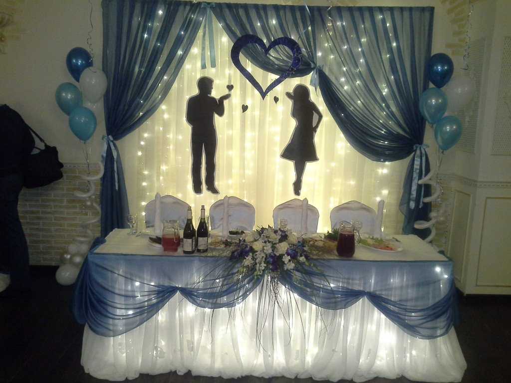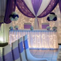 The main attention of the audience during the celebration will be riveted to the table for the newlyweds. In addition to the basic decor, use original compositions. Pay attention to tablecloths and ruffles. The garland along the table can be illuminated from the inside with small bulbs. Remember that in the overall picture it is worth using no more than three colors.