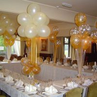 So that bouquets and compositions of balls do not overload the chairs and tables, fill them with helium, let them soar in the hall under the ceiling or above tables, creating fabulous pictures. Ordinary balls can be replaced with original models sold in special stores. Through such a simple replacement, your room will sparkle with new colors. Instead of hanging pendants from balls, it is important to use street lanterns with candles burning inside. Decorate them with butterflies so that the composition resembles a fairy forest. You can supplement the picture with fresh flowers suspended on a translucent fishing line.