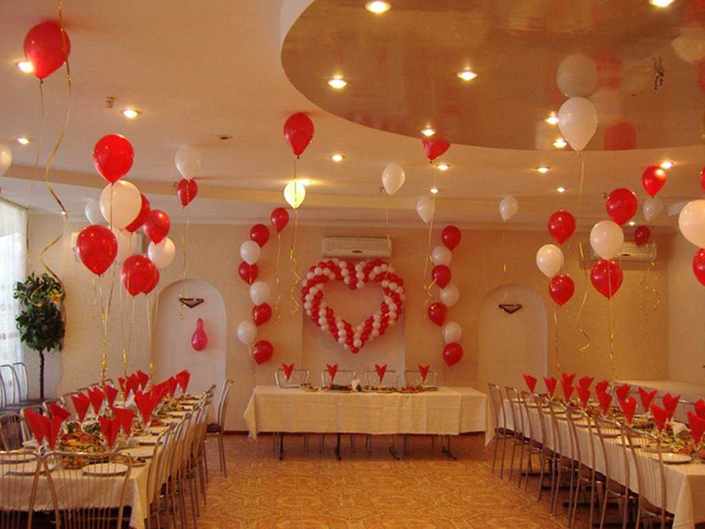 Decoration of the hall requires a certain imagination. The most uncomplicated way to add charm to a room is to saturate it with compositions. Balloons, fresh flowers and seasonal natural materials will help you (for autumn - yellowed leaves, for winter - flowers powdered with imitation of snow).