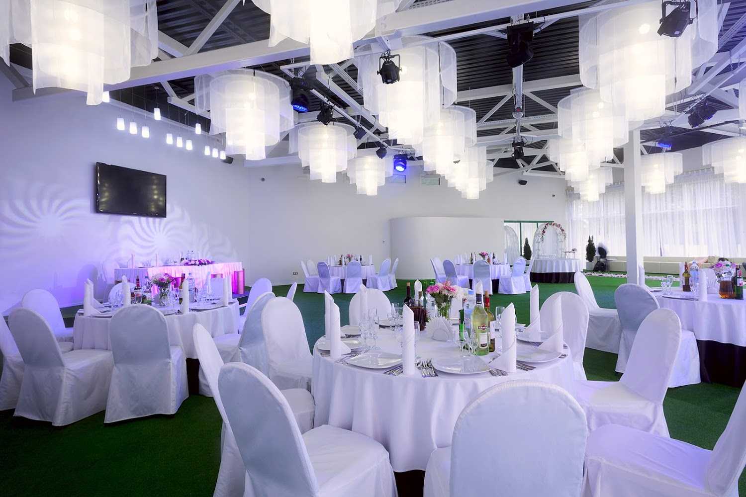 The drapery of the wedding hall in the modern version often combines white, golden, silver shades. The contrast of white and red colors is also in fashion. Basic white or champagne can be diluted with a bright accent of blue, purple, turquoise or lilac. Originality is created by the details: a vase that attracts attention, a statue, a garland, a flower arrangement, furniture, etc. To do something with your own hands is fashionable. The uniqueness of each item creates its own value. The modern room is decorated not only in the food area. Do not forget about the stairs, stage, photo zone and other corners of the room.