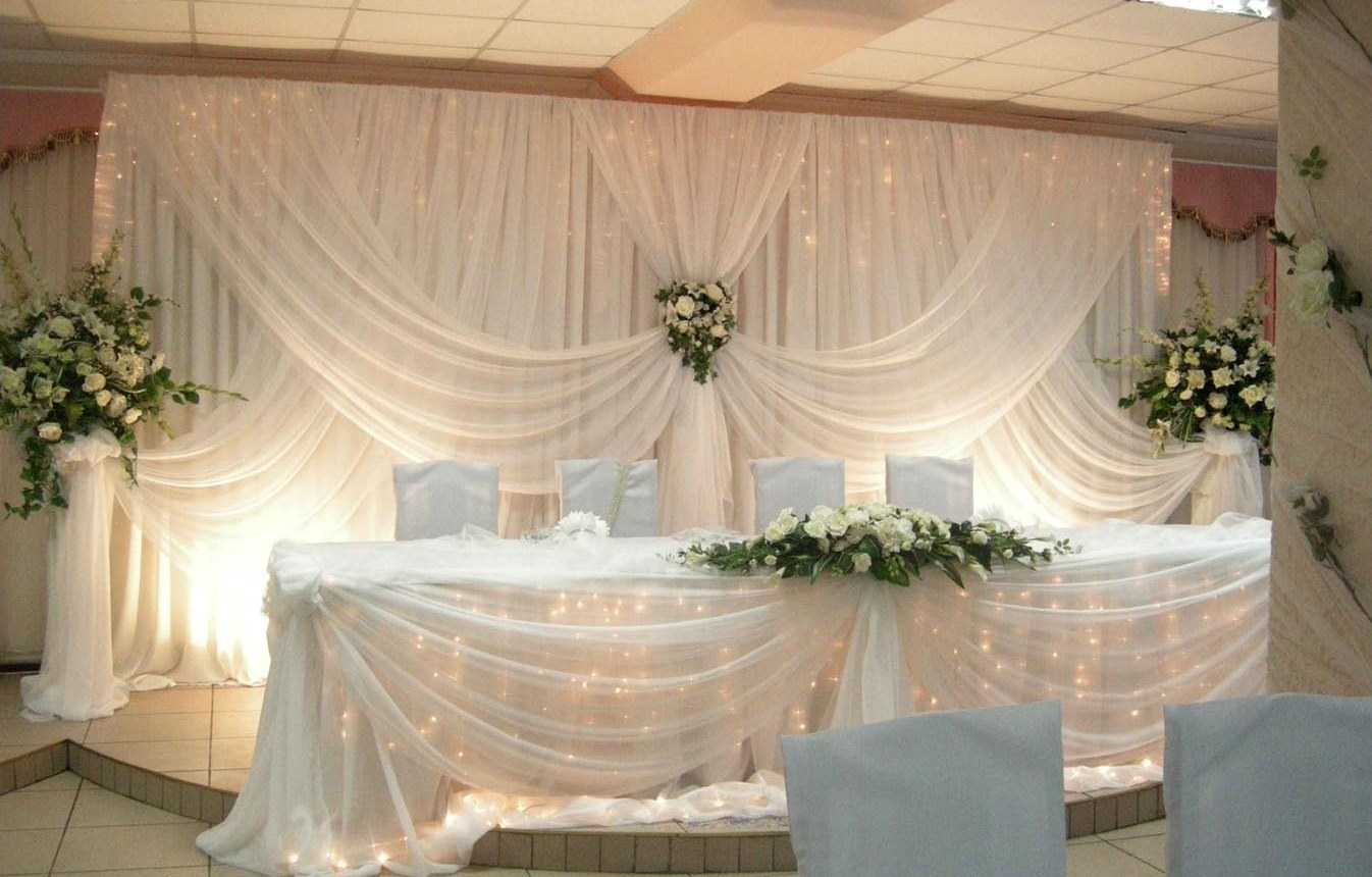 The easiest way to decorate the room with a cloth in a self-made decor. Overflows, sparkle of draperies will bring their own charm and will look minimalistic. In fabric, give preference to satin for decoration of a wedding table. It is better to decorate walls and arches with organza or alternative airy fabrics. To hide the borders of the fabric, you can use bows or ribbons.