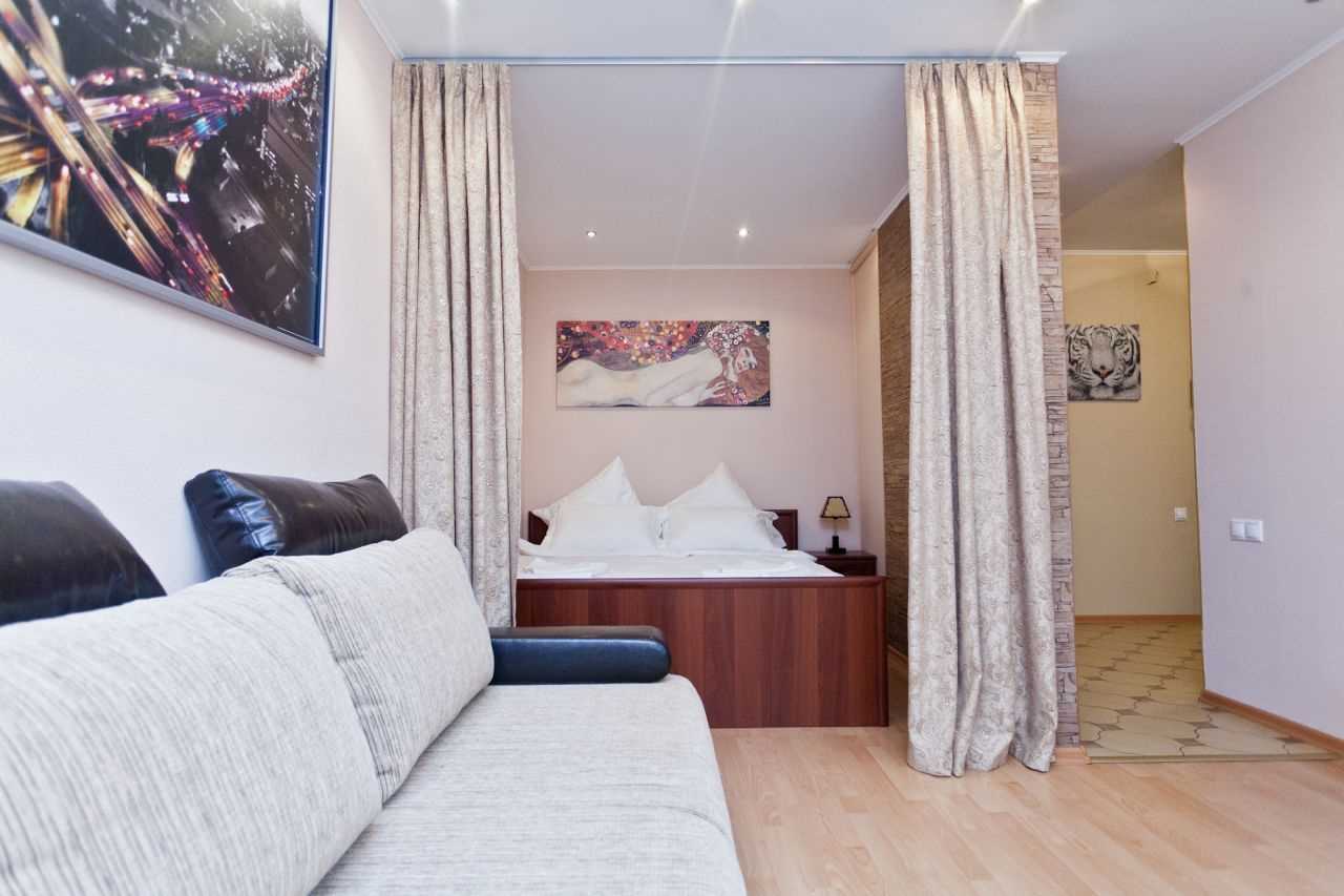 The bed will be the most valuable in the room, since it should be hidden from prying eyes. A good choice to isolate the bedroom from the recreation area, while not taking the space.
