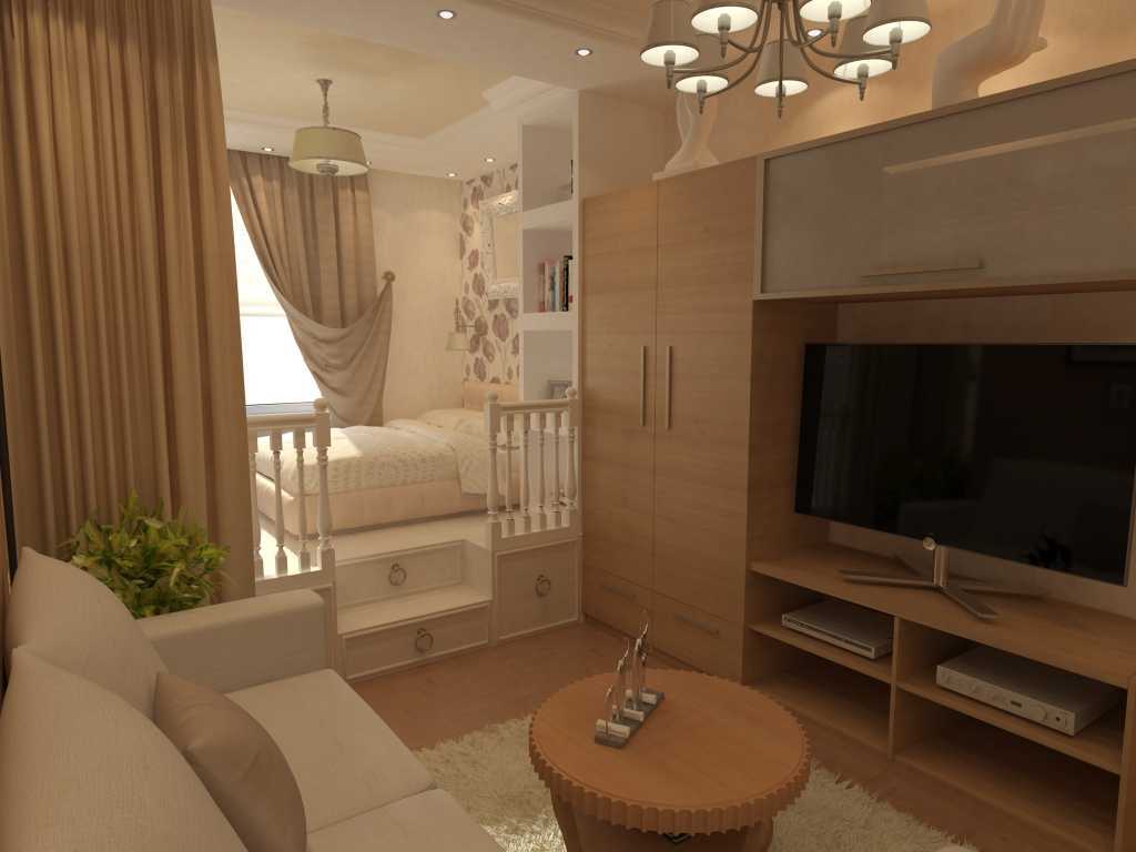 Design a living room bedroom with a podium