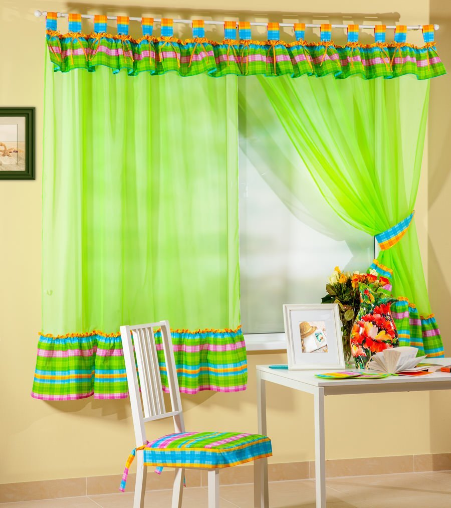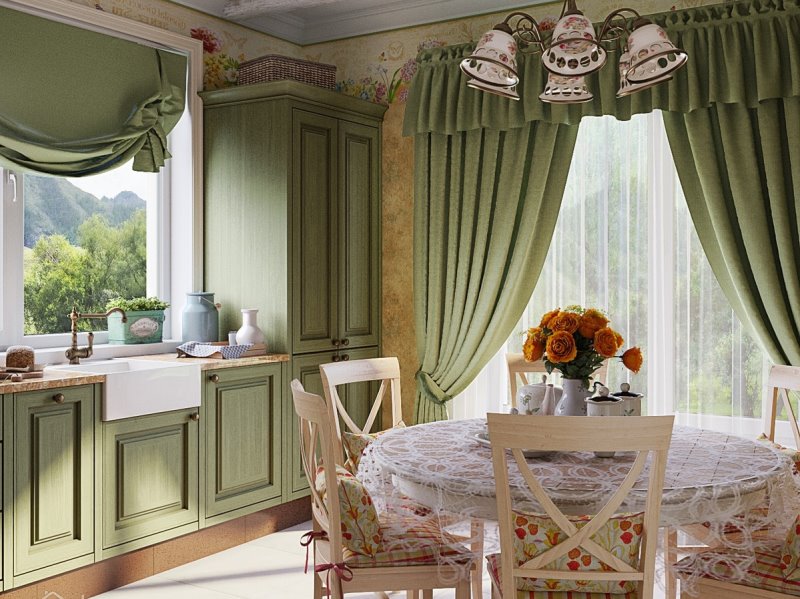 - Kitchen. Juicy green color perfectly promotes appetite, so it is often used in the design of the kitchen. Curtains in the kitchen are best chosen from a practical material that is easy to wash and does not require special care. Suitable shades: light green, lemon, saturated olive, light colors. In the kitchen, various patterns, both floral and geometric, look great.
