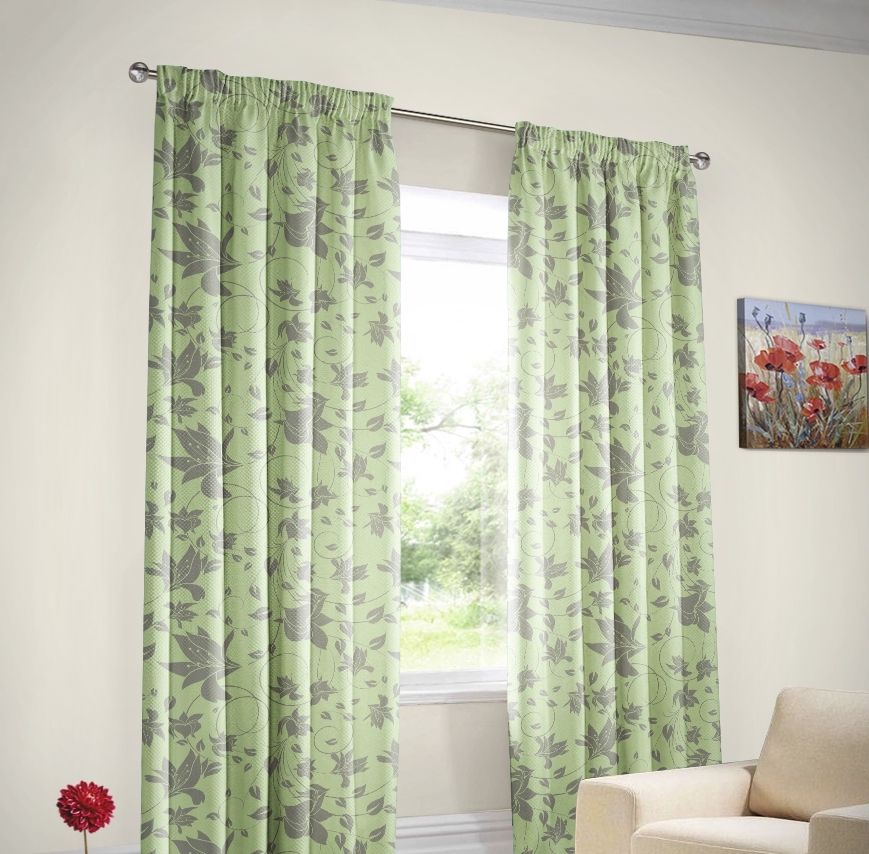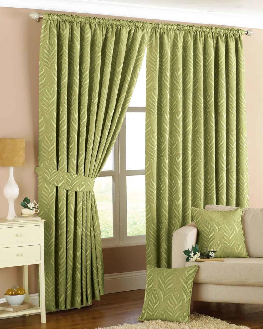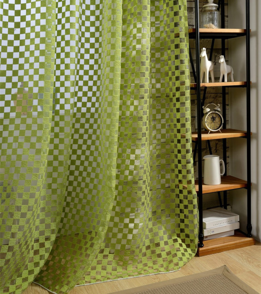 Green curtains are good because letting in bright sunlight, they fill the entire room with a soft natural glow. In this case, the green color creates a natural atmosphere and positively affects the psychological situation in the house or apartment.
