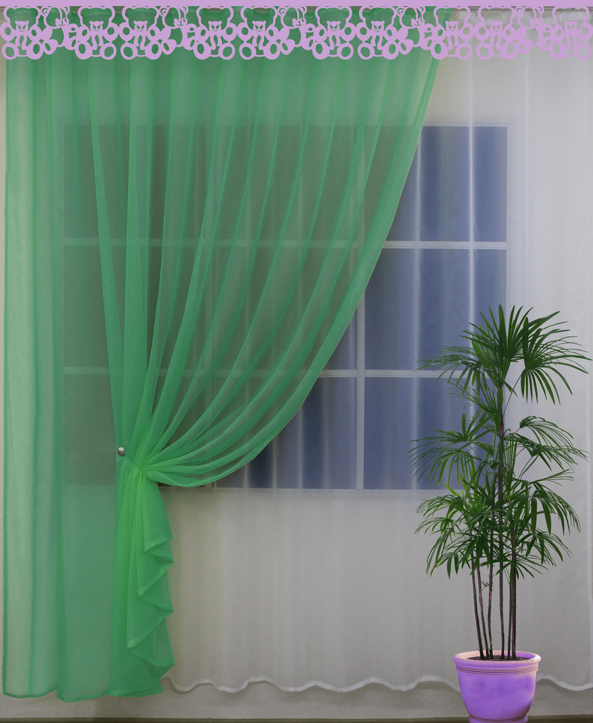 In the bedroom, green curtains go well with white light tulle