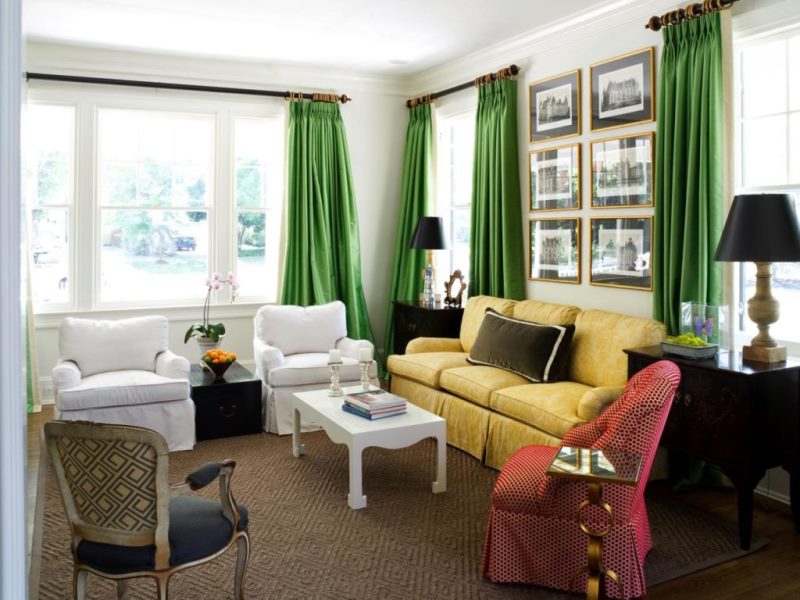 Saturated emerald curtains will add brightness to the interior of the living room