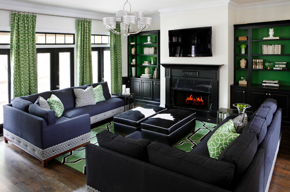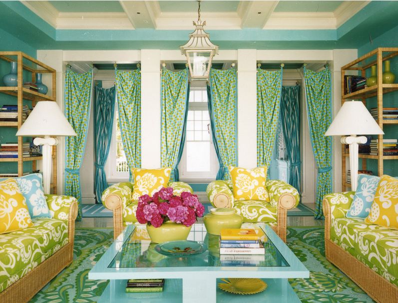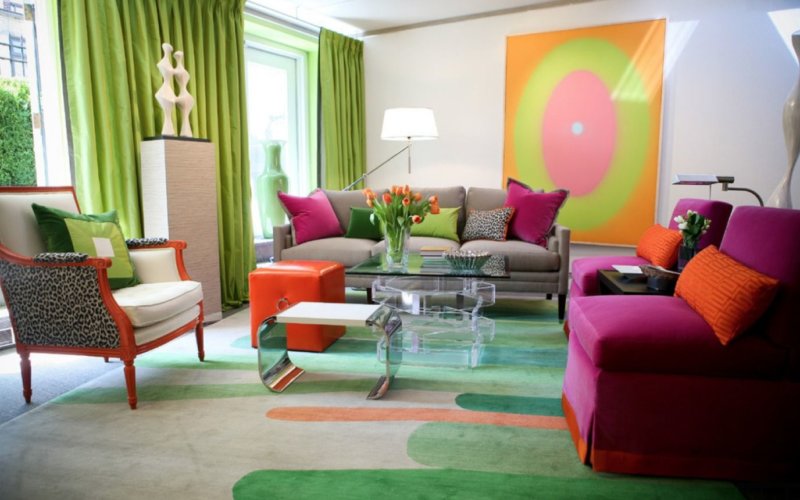 Many designers choose bright green to create color contrast. The room can be decorated in soothing cream colors, curtains, sofa cushions, a carpet or a chandelier can be saturated green, which gives a feeling of freshness and vitality. This technique is a win-win and is most suitable for a living room, in which there is more space to beat an unusual combination of color.