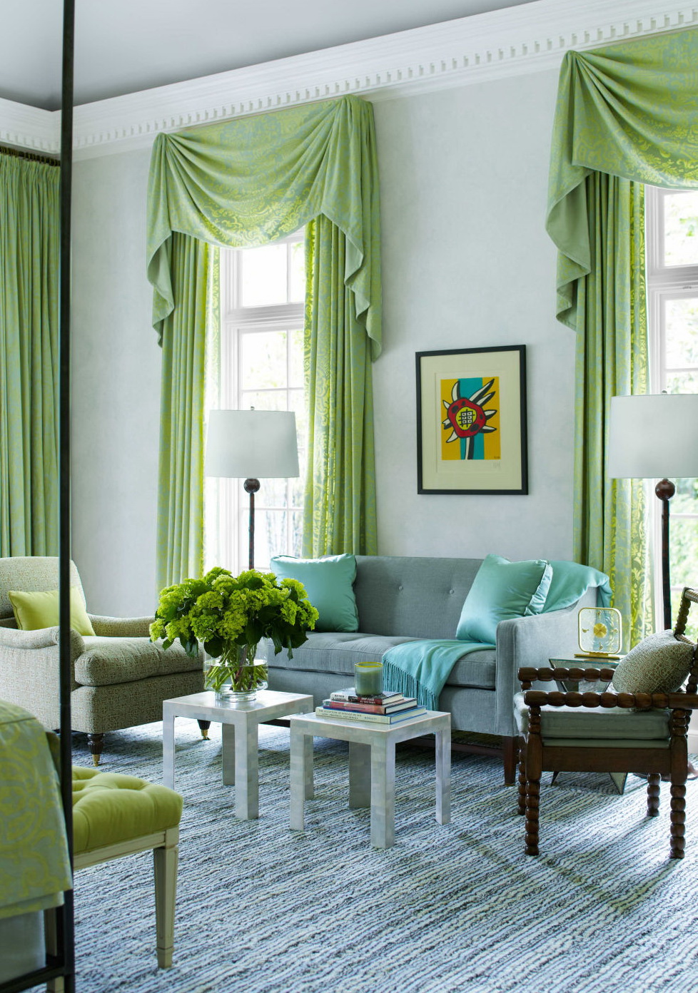 Light patterns on mint curtains accentuate the elegance of a classic style.
