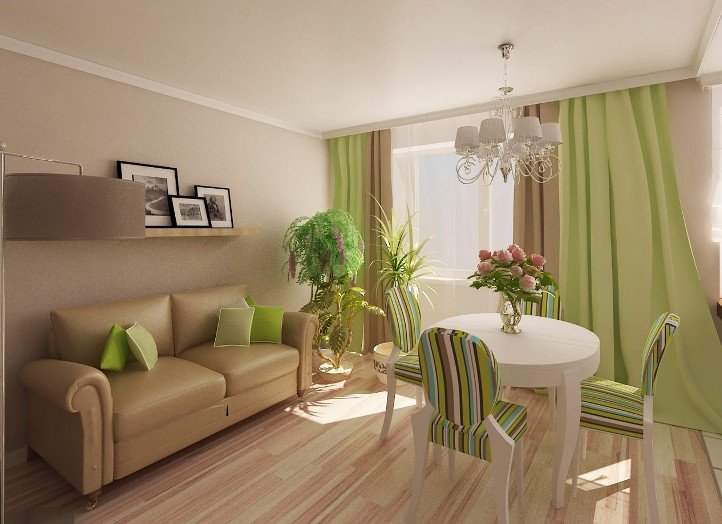 The windows of this living room are decorated with green curtains of a natural shade, complemented by inserts of brown material, which gives a greater contrast to the overall textile composition