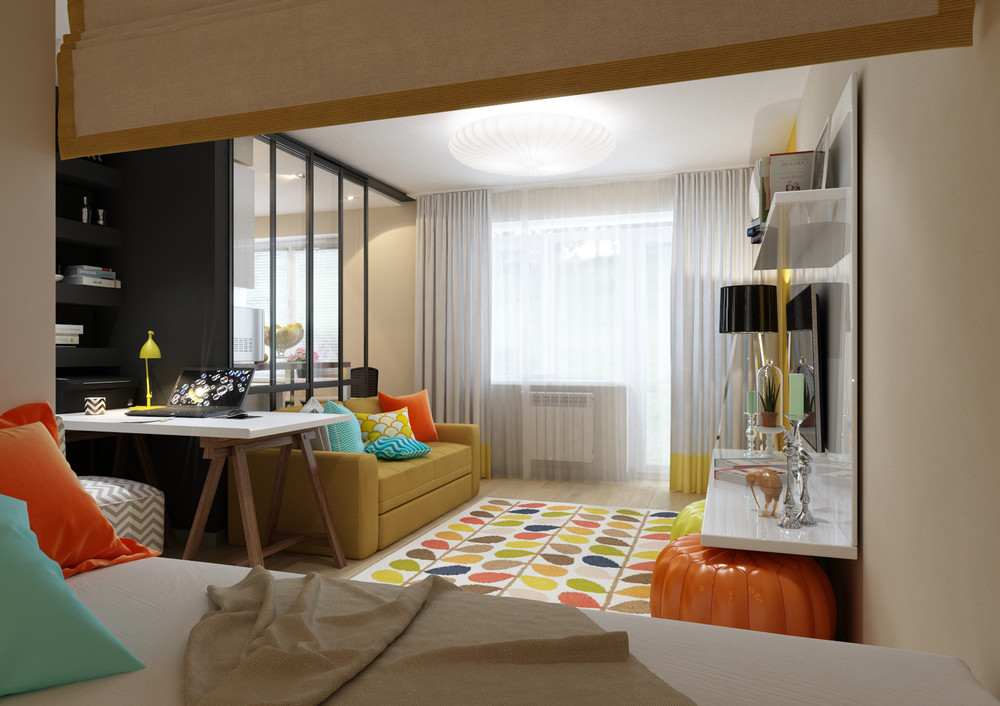 Reception is popular for increasing usable area. The loggia can become a separate zone and can be separated from the room by a bar counter or a low counter. Sometimes a balcony is made a full part of the room. Be sure to carry out thermal insulation of the structure in this case.