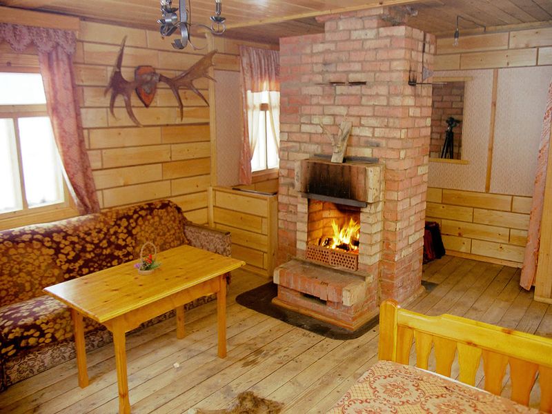 A warm home interior created using logs, wooden beams, a fireplace and decorative elements made of wood will be comfortable.