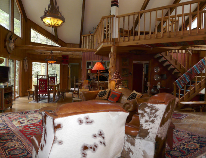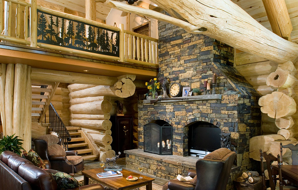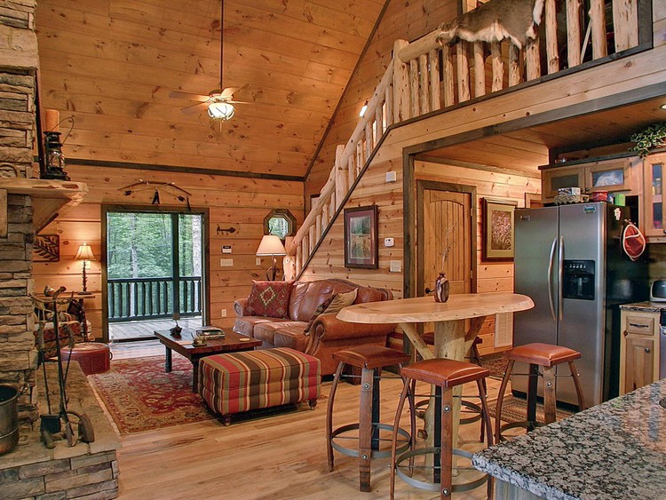 If you will design interior rooms in the style of a hunting lodge, focus on furniture.For example, in the bedroom, be sure to get a massive double bed made of rough processed wood. Use colors predominantly dark. The walls of such a lounge are decorated with stuffed animals, deer horns, shotguns and other relevant elements.