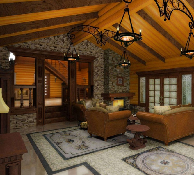 It will also be appropriate to emphasize the decoration of one of the walls with natural stone. So your hunting lodge will receive a specific change in the direction of the medieval castle.