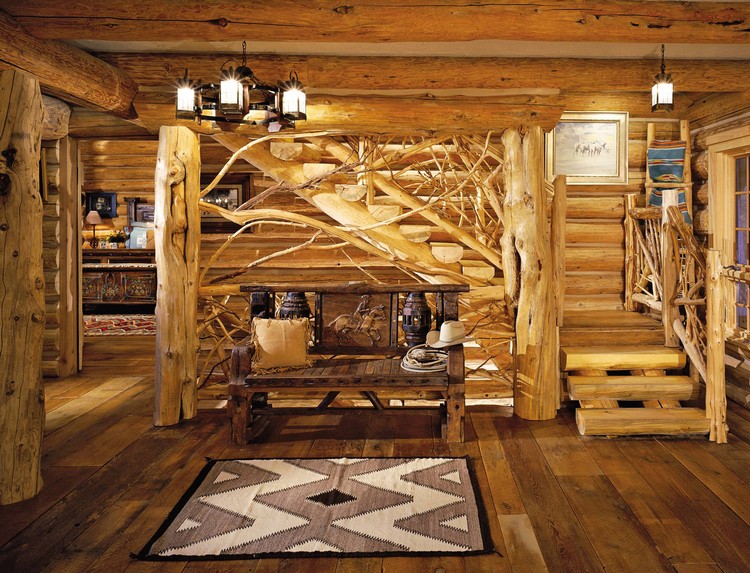 The ceiling is decorated with massive branches, which previously removed the bark. Special processing of these decorative elements will add mystery to the interior of a wooden house.