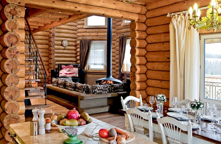 The interior in the style of the Russian hut includes log walls, wooden furniture and a stove in the middle of the room, which is often changed into a fireplace in modern houses