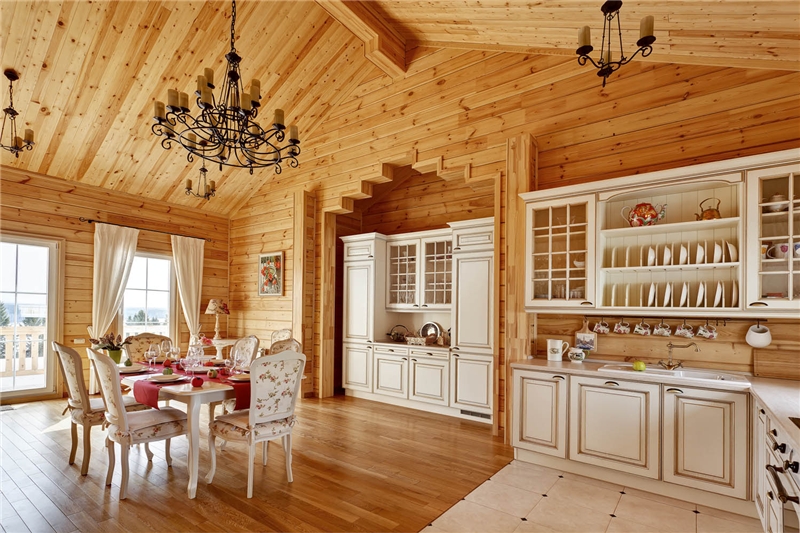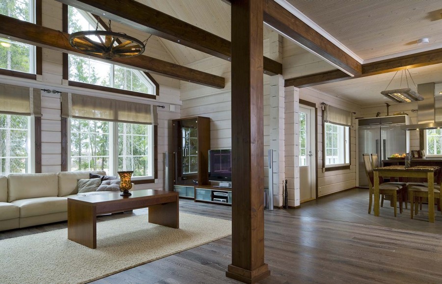 Due to the large selection of specialized impregnations for wood, almost any interior style is equipped in such a house. French "Provence" for the kitchen, Italian "Modern" for the living room, "Scandinavian" style for the restroom - with the right choice of shade of paint or impregnation, you can finish the room even under "Hi-tech".