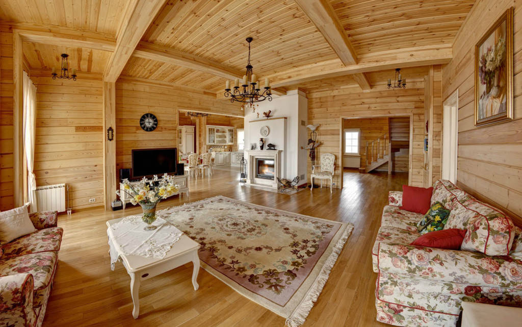 The drawing room is a place where many friends and relatives gather. For a house built of wood, there is an original way to decorate the interior of this room. During the construction of the cottage, the project provides for the layout of a living room with a high ceiling. In the presence of the second floor, the overlap may be completely absent.