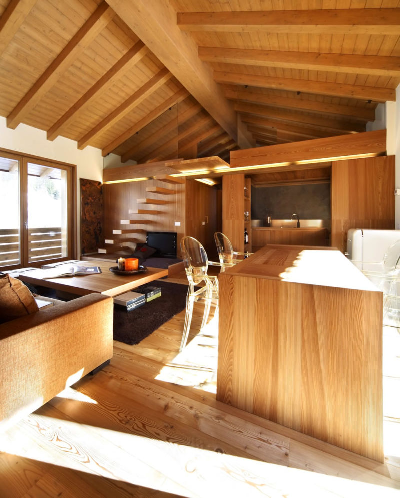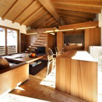 Swiss chalets are gaining popularity in our country. The so-called "shepherd’s houses" are erected most often from glued beams or logs. The internal layout of such structures has an extraordinary architecture, so the chalets are in great demand. Finishing options for such cottages are no different from the interior of a wooden house inside. The widespread use of natural stone, ceramic tiles, as well as the same wood bring a noble, expensive look to the interior.