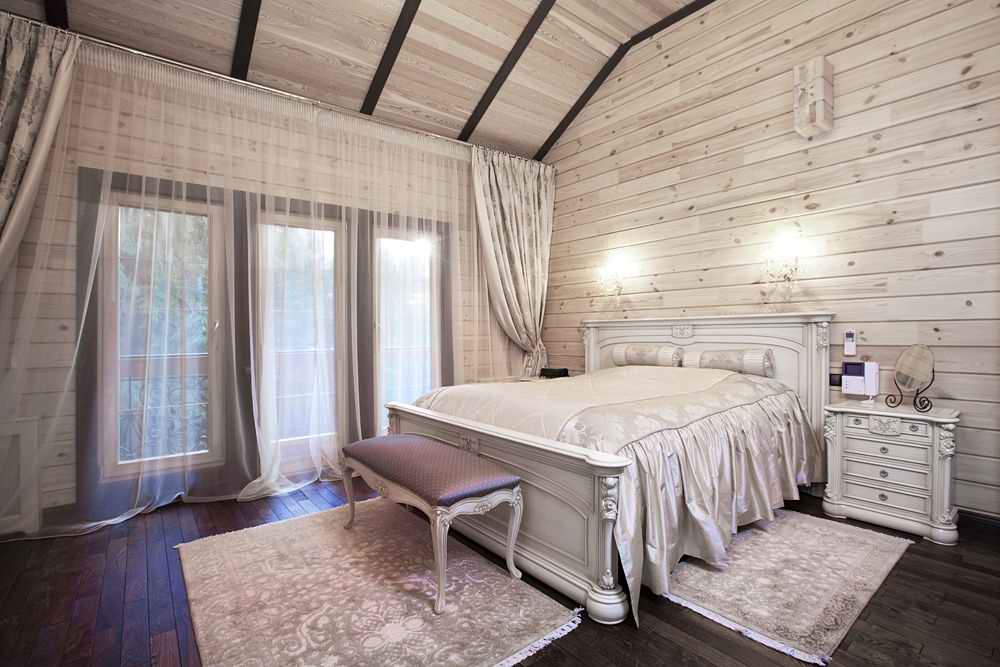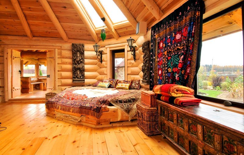 It is possible to decorate a cottage with small decorations built from a profiled board. Skins of animals, painted curtains, and folk fringe are also suitable here. Additionally, the floor is covered with a luxurious carpet embroidered with patterns.