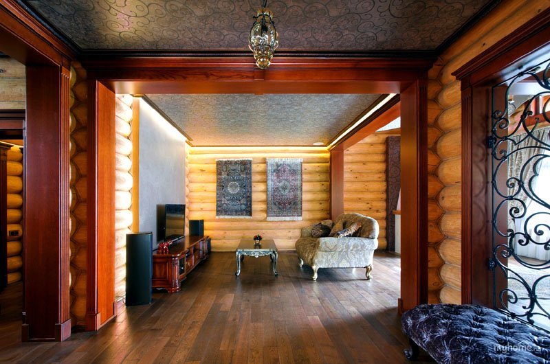 The main feature, as well as the difficulty of designing this type of structure, is the widespread use of wood. It is everywhere. Log walls, ceiling (or ceiling, depending on the number of storeys), and even the floor is made of boards. With such an abundance of homogeneous building material, there is a need to diversify the interior decoration.